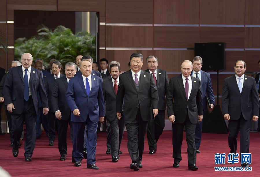 這是習(xí)近平和出席開(kāi)幕式的外方領(lǐng)導(dǎo)人共同步入會(huì)場(chǎng)。 新華社記者李學(xué)仁攝